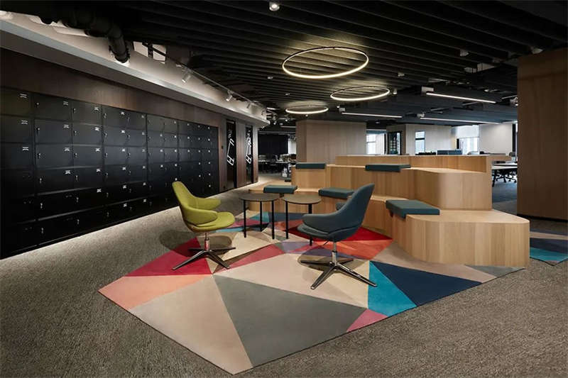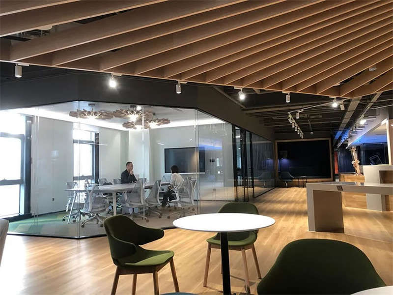 材料運(yùn)用上,采用一系列天然、可再生和低排放的節(jié)能措施和材料,讓員工感受到與自然的聯(lián)系,同時(shí)提供了室內(nèi)聲學(xué)舒適度。還采用了公司貿(mào)易產(chǎn)品——玻璃,各種玻璃的運(yùn)用,充分體現(xiàn)了企業(yè)性質(zhì)及對玻璃加工工藝的理解,既作為裝飾材料,也讓辦公區(qū)各個(gè)區(qū)域都成了產(chǎn)品展示區(qū),電梯廳和門廳運(yùn)用了黑色背烤漆蒙砂玻璃,電梯廳頂部運(yùn)用黑色銀鏡腐蝕雕刻形成總部辦公地所在的區(qū)域地圖,其他區(qū)域也充分將壓花玻璃、幕墻玻璃、淋浴隔斷玻璃及辦公高隔玻璃等進(jìn)行了充分展示。