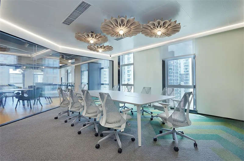 在空間規(guī)劃設(shè)計(jì)上,進(jìn)行了動(dòng)靜分區(qū),并打破了原有的動(dòng)線,路線上進(jìn)行了延伸、切角設(shè)計(jì)。在規(guī)劃各個(gè)功能空間中,充分考慮到建筑外光線與景觀的因素,將最好的光線位置留作員工咖啡交流及健身區(qū),將最好的視野區(qū)域作為總部接待大會(huì)議室。充分利用自然光,向員工傳遞正能量,其中亮點(diǎn)是每一個(gè)部門之間都設(shè)計(jì)了開放或半通透的多功能交流區(qū)域。讓員工參與互動(dòng)活動(dòng)、討論或組織公司活動(dòng),這種輔助辦公空間充足的情況下,有助于緩解員工工作中的所有壓力,幫助他們度過閑暇時(shí)光。