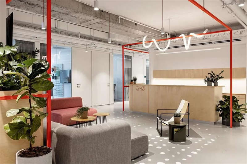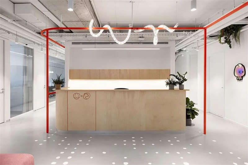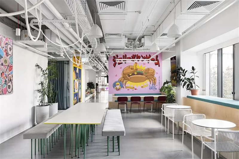 本案的設計出發(fā)點旨在創(chuàng)建一個獨特的空間體驗。在以混凝土、裸露的白色天花樓板、綠色植物、天然木材和白色金屬構筑的中性調(diào)空間背景中,注入跳躍的色彩和卡通圖形設計去展現(xiàn)其設計理念。