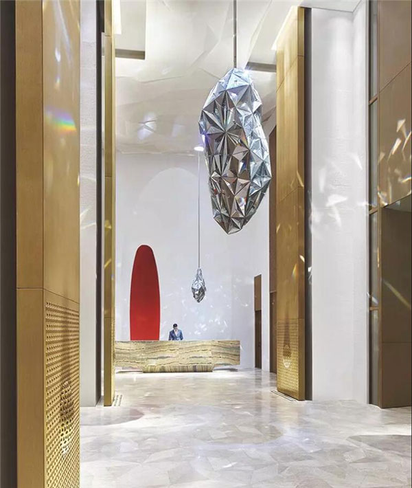 科威特四季酒店從酒店樓頂延伸下來(lái)的金屬裝飾吊頂,在燈光的照耀下閃著彩虹般的色彩,灑落在大堂的每一個(gè)角落,大堂的紋理石灰石墻壁延伸至近9米高的天花板。金黃色的固裝家具與灰色空間搭配,形成鮮明對(duì)比,猶如現(xiàn)實(shí)與幻想的花園,讓人不由得驚嘆。
