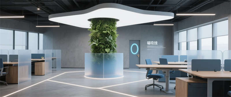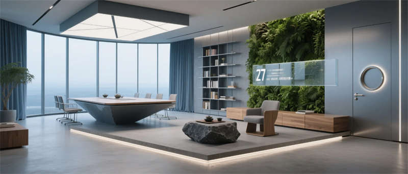 本項目以“未來生態(tài)辦公”為核心理念,打造1200㎡科技與自然交融的創(chuàng)新型辦公空間。設(shè)計采用啞光太空灰為主基調(diào),通過霧霾藍企業(yè)色與原木紋理的碰撞,在冷峻科技感中注入人文溫度。空間以微水泥地面為基底,貫穿透光亞克力與陽極氧化鋁材質(zhì),配合隱藏式線性燈帶的流動光影,構(gòu)建出具有呼吸感的數(shù)字美學(xué)場域。