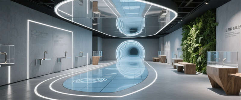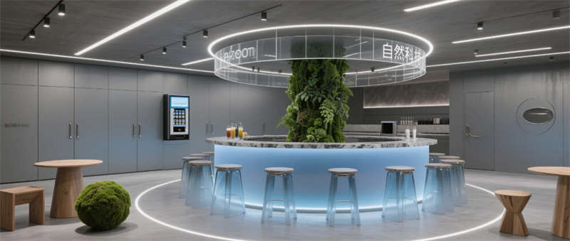 各區(qū)域通過四大統(tǒng)一性語言緊密串聯(lián):霧霾藍橢圓金屬門把手貫穿全空間,再生材料家具呼應(yīng)可持續(xù)發(fā)展理念,聲學(xué)墻面嵌入本地植物標(biāo)本強化生態(tài)屬性,智能燈光系統(tǒng)則通過4000K色溫線性燈帶實現(xiàn)晝夜場景的無縫切換。特別設(shè)計的全息投影展廳與智能階梯會議室,通過LED交互地屏與AR懸浮展臺,將品牌科技基因融入空間體驗。