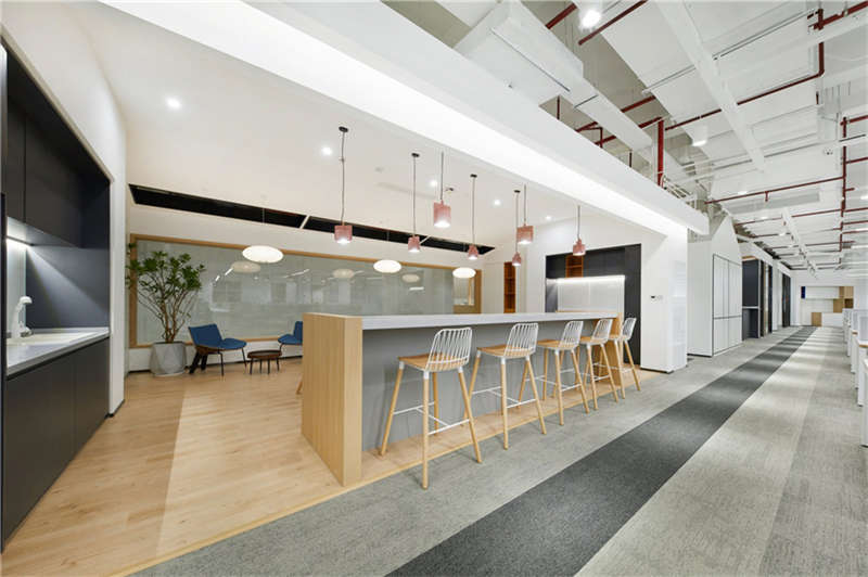 工位數(shù)量需求雖然龐大,但甲方對多元化的功能區(qū)的需求并未減少。于是我們將咖啡吧、茶水間、休閑區(qū)這幾個功能進行融合,破除了空間的界定,將水吧區(qū)打造成一個開放性的多功能區(qū)域,賦予它全新定義,從而達到滿足員工的一系列休閑目的。