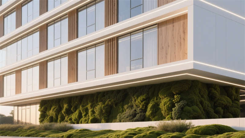 本案立足合肥科技創(chuàng)新城定位,以“自然滲透科技”為核心策略,打造7000㎡智慧辦公綜合體。外立面通過雙層呼吸式幕墻與垂直木紋格柵交織,形成動態(tài)光影濾網(wǎng),底部苔蘚景觀帶同步凈化PM2.5,實現(xiàn)建筑與巢湖生態(tài)區(qū)氣候的有機對話。