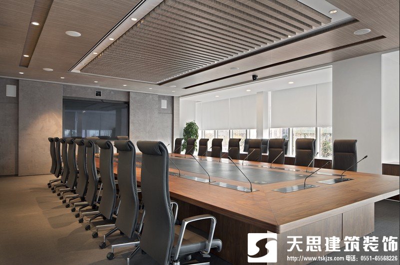 會(huì)議空間的基本風(fēng)格由會(huì)議用桌椅的款式和造型來(lái)決定,界面裝飾應(yīng)圍繞這個(gè)中心展開(kāi),頂棚的主要作用是提供照明,并通過(guò)造型來(lái)形成虛擬空間。地面一般作為一個(gè)完整界面處理,如需要也可通過(guò)不同材質(zhì)或利用不同標(biāo)志來(lái)劃分區(qū)域。