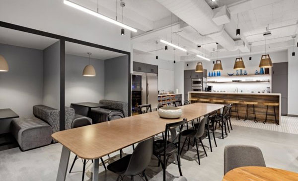 大型咖啡館和食品儲藏室是為協(xié)作而設(shè)計(jì)的,是辦公室的公共中心。一張長長的餐桌、展位、座位和休息區(qū)為非正式會議、社交聚會的地方。