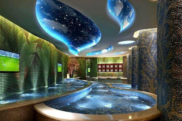 洗浴中心主要和水打交道,因此裝修最主要的是要做好防水功能。會所顧客與地面接觸時間最長,而與墻面一般不直接接觸,所以選擇地面材料要關(guān)注品質(zhì),地面建議走好防水。地磚的選擇注重質(zhì)量,而墻磚更多講究美觀,如果想要裝修省錢,可以在墻磚上下功夫。