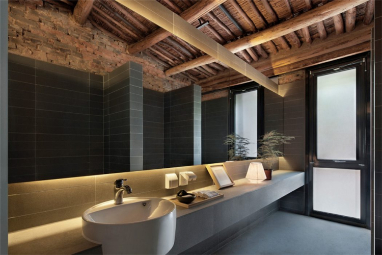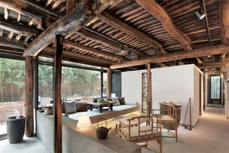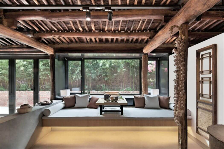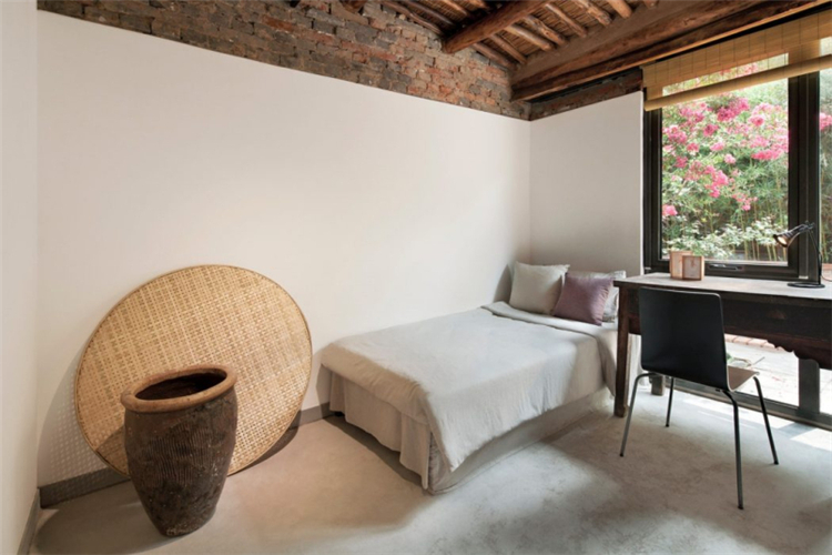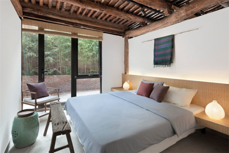 而我們在這次的民宿的功能布局方面,我們根據(jù)與居民的詳細溝通,了解他們的日常生活和習慣,進行調整,重新組織平面圖。在我們拆除吊頂后,更多的空間被釋放,原始的木結構和稻草覆蓋的天花板紋理終于顯露出來,講述了一個時間的故事。在現(xiàn)場勘察過程中,我們在建筑物西側和鄰近墻壁之間發(fā)現(xiàn)了一條約80厘米寬的狹窄通道。因此,我們在走廊盡頭向西側設計了一個觀景窗。在窗外,擺動的竹影有助于將室內空間與自然環(huán)境相連。