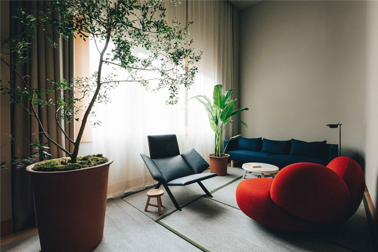 此酒店設(shè)計(jì)在進(jìn)行內(nèi)部改造時(shí),盡力尊重了建筑物的原始特征。因此,建筑地板擴(kuò)建時(shí)采用了與原建筑相同的混凝土材料加以打磨,雪松木和日本灰泥等傳統(tǒng)材料的使用也是為了保留建筑過(guò)去的痕跡,營(yíng)造出歲月感。此外,以“aimai”為設(shè)計(jì)理念,設(shè)計(jì)師在酒店的一系列空間中創(chuàng)造出“無(wú)形”的氛圍,通過(guò)模糊不同空間的邊界,使空間成為能夠適應(yīng)不同變化的多功能區(qū)域。這個(gè)理念在接待處等公共空間得到了最好的體現(xiàn),接待處逐漸延伸進(jìn)酒吧及餐廳,因而兼具咖啡吧的功能。這樣的混合空間,得益于酒店將所有空間及功能交互融合的愿景。