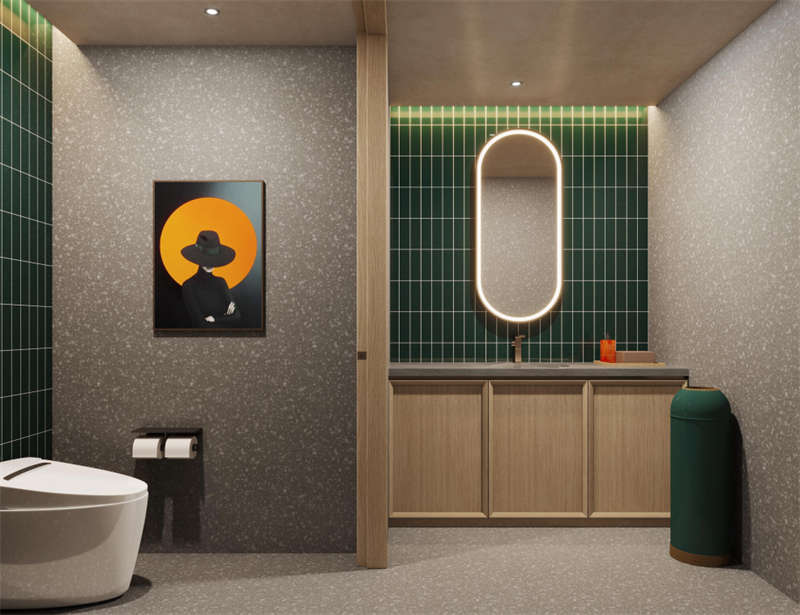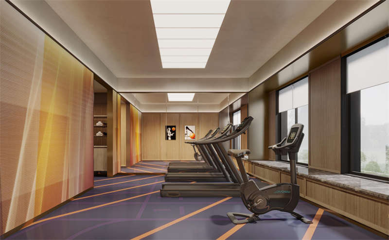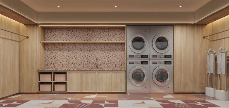 健身房、洗衣房和會(huì)議室旨在滿足游客的多功能需求。同時(shí),它們的設(shè)計(jì)也與空間風(fēng)格和視覺美感相對(duì)應(yīng)。統(tǒng)一的木飾面作為空間底座,運(yùn)動(dòng)紋地膠和定制彩紋點(diǎn)綴健身房的生機(jī)與活力。精致的水磨石桌面、咖啡乳膠漆和方形形式的活力圖案地膠為洗衣房增添了柔和感,而開放式會(huì)議室的簡約風(fēng)格則是綠色墻布和定制的博龍地毯的產(chǎn)物。