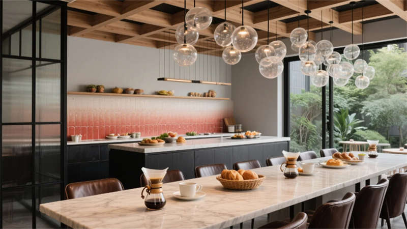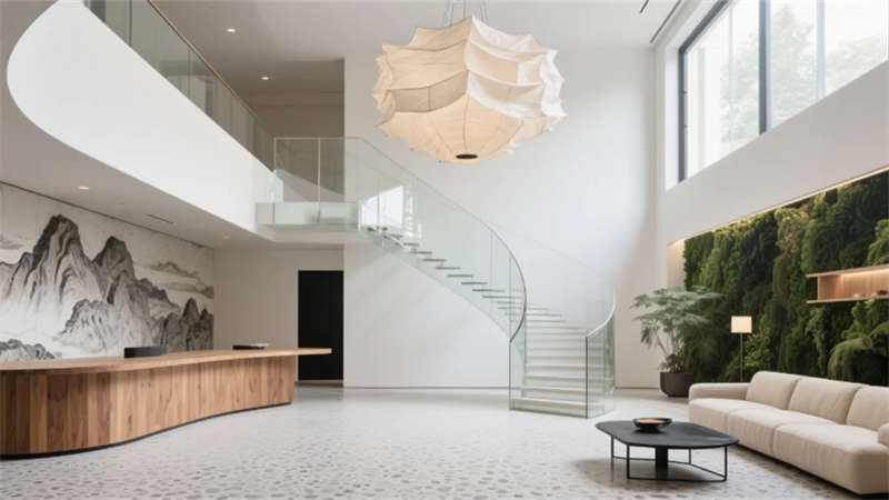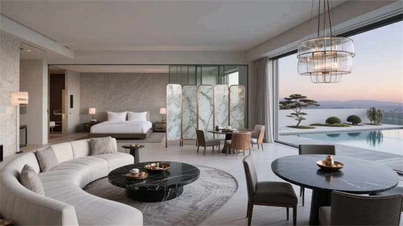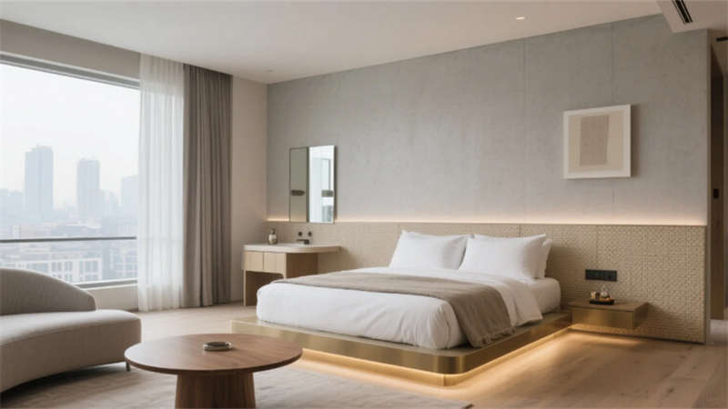 步入挑高的大堂,原木與石材的碰撞詮釋著質(zhì)樸的高級(jí)感。懸浮玻璃樓梯如透明絲帶盤旋而上,紙藝褶皺吊燈灑下柔和光暈,綠植墻在隱藏式燈光中若隱若現(xiàn),仿若一幅當(dāng)代山水畫卷。客房以暖灰與米白為基調(diào),亞麻、微水泥與天然木紋織就療愈氛圍,弧形沙發(fā)與嵌入式燈帶讓空間流動(dòng)著溫柔詩(shī)意,落地窗將城市天際線化為朦朧背景。