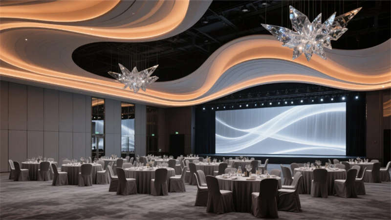 全日餐廳以陶土色格柵天花呼應(yīng)徽州傳統(tǒng)工藝,吹制玻璃吊燈如晨露凝結(jié)空中;宴會(huì)廳則化身未來(lái)劇場(chǎng),波浪形織物天花與全息投影幕布共舞光影。行政樓層的商務(wù)休息區(qū),深灰毛氈墻面與古銅金屬細(xì)節(jié)沉淀出理性優(yōu)雅,窗外綠意透過(guò)玻璃隔斷滲入交談空間。從屋頂無(wú)邊泳池俯瞰,建筑與巢湖的瀲滟水色遙相呼應(yīng),于繁華處開辟一方隱逸凈土——這里不僅是居所,更是一場(chǎng)喚醒感官的設(shè)計(jì)敘事。