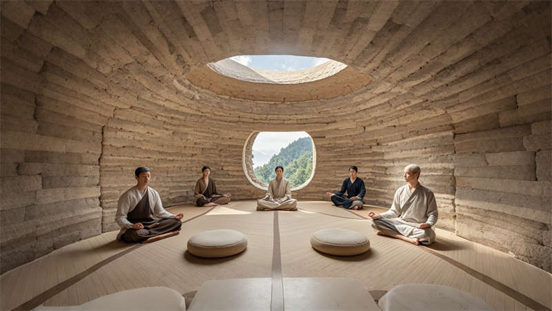 設計亮點包括:1)夯土墻面內置光纖導光系統(tǒng),夜間呈現(xiàn)星圖光影;