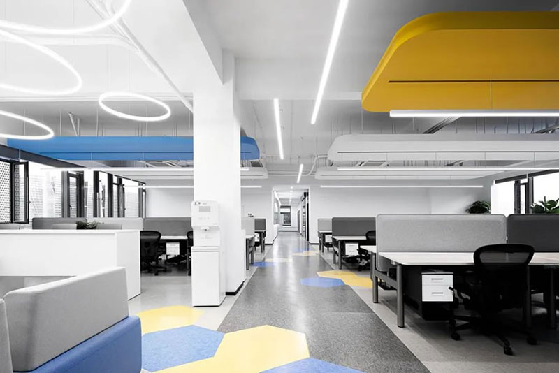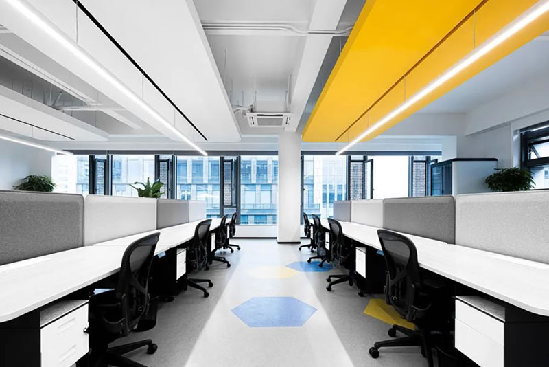 開放工位的造型吊頂與地面色塊相互呼應(yīng),輕松有趣的氣質(zhì)穿梭在人員協(xié)作之間,中性色彩辦公家具在細節(jié)上增加耐用和降低視覺刺激導致的疲勞感。真正舒適的空間做到與功能需求一致,提供給使用者專心的設(shè)施和敏捷的思路。