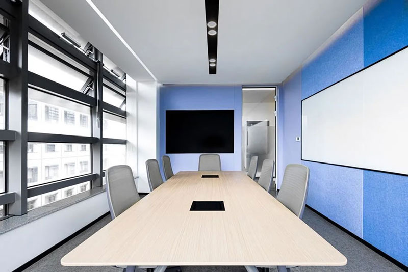 封閉會議室采用玻璃隔斷既保留了采光也確保了隔音需求,配合磨砂膜的使用保護了使用人員的私密性。