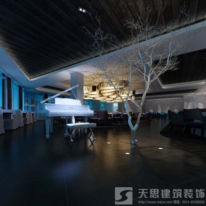 總設(shè)計說明:本案集餐廳和酒吧于一體,主題為樹影婆娑,采用大量的直線和簡單形體元素。給人的感覺是舒適、魅力、神秘、時尚、嫵媚。