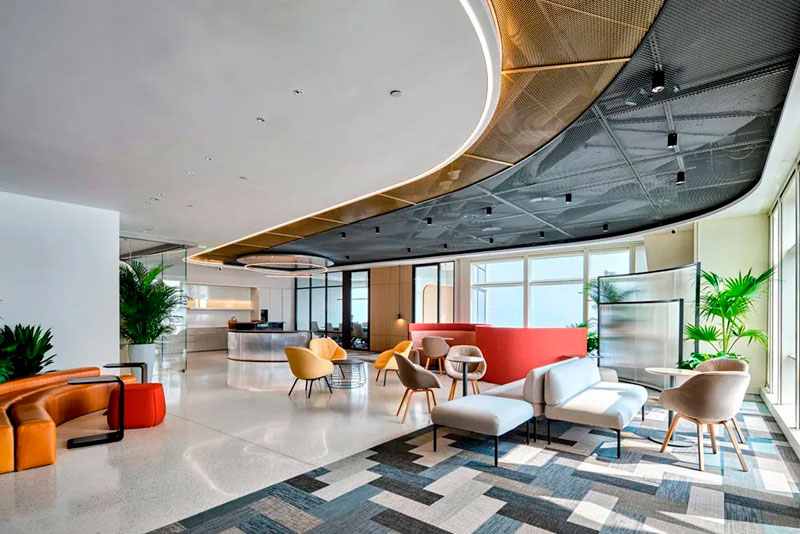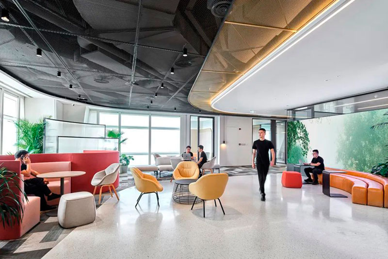 不同于投資公司的傳統(tǒng)形象,設(shè)計(jì)師以一個(gè)圓島吧臺和開敞的自由交流區(qū)作為前廳接待場所。大量的自然光涌入室內(nèi),明凈開闊。天花地面是圓轉(zhuǎn)流動(dòng)的曲線造型,采用水磨石地面、金屬網(wǎng)天花、Bolon塑膠地毯等各種新環(huán)保材料,輔以色彩鮮麗的多功能家具組合、大型LED屏和隨處點(diǎn)綴的綠植,呈現(xiàn)出年輕、現(xiàn)代、科技而又充滿能量的生命氣息。