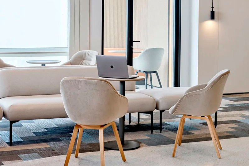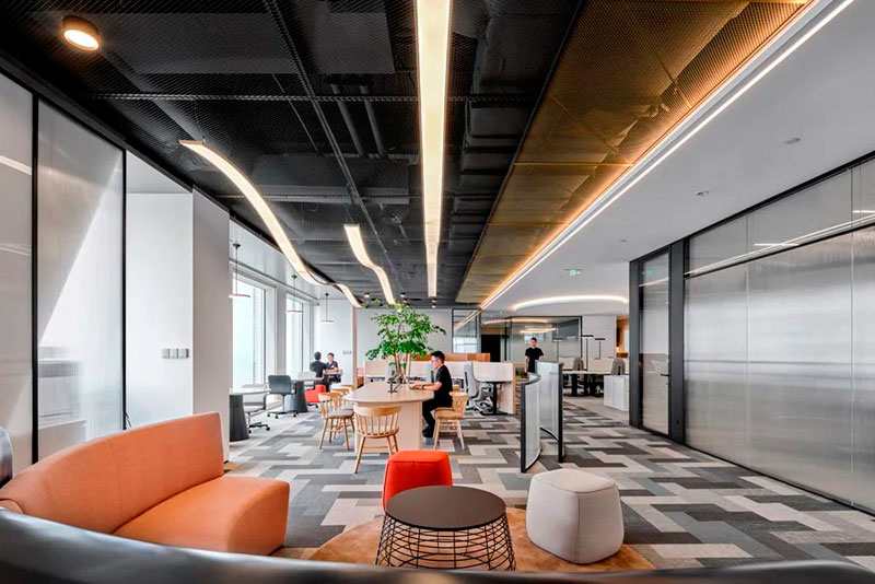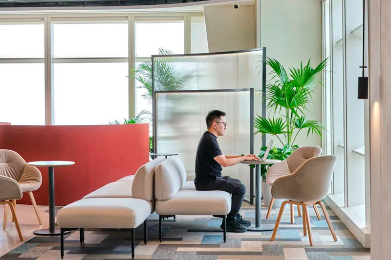后場辦公區(qū)延續(xù)了前廳的辦公理念,結(jié)合不同功能形式的會議室、電話間,提供了多選擇的工作模式,簡潔而高效。大量可再生面料的墻飾、可回收吸音板和仿生苔蘚的應(yīng)用,豐滿了視覺層次并極大提升了空間的聲學(xué)效果。