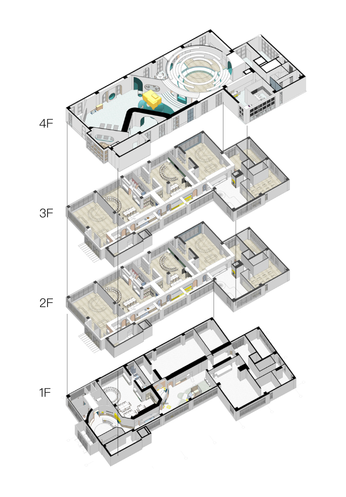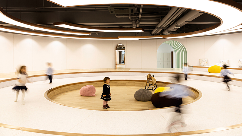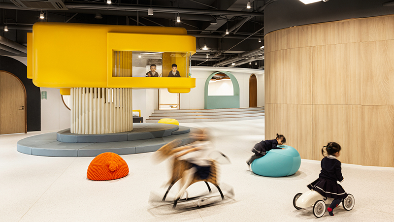 兒童喜歡通過身體來丈量和感知空間.因此,創(chuàng)造符合兒童生理尺度的空間能夠激發(fā)更多的行為方式.兒童也常喜歡待在自己可觸摸到的小空間中.設(shè)計(jì)創(chuàng)造出的空間價(jià)值可以賦予使用者特殊的魔力,在豐富多樣的教娛空間中,每一個(gè)孩子都是不受束縛的夢想家.用簡潔明亮的色彩把控,勾勒出空間內(nèi)不失童趣的高級質(zhì)感,培養(yǎng)孩子的基礎(chǔ)美學(xué)與審美素養(yǎng),正是空間帶來的啟蒙.
