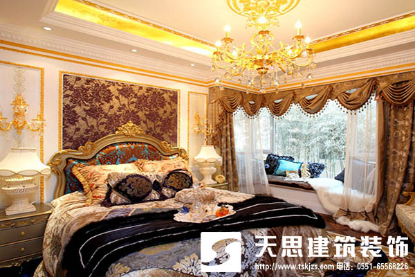 這個(gè)和上圖有明顯的區(qū)別,這是一個(gè)歐式裝修風(fēng)格的臥室。吊頂采用極為歐式還有布藝窗簾。燈槽也是采用了金色作為背景色。使整個(gè)空間看起來極為金碧輝煌,更中式的比較歐式顯得比較富麗堂皇極為惹眼。但是中式講究的低調(diào)內(nèi)涵,大氣和沉穩(wěn)。這只是燈飾在兩種中袖風(fēng)格中不同的作用。其實(shí)現(xiàn)實(shí)中裝修風(fēng)格多樣化,配合裝修材料和軟裝的搭配選擇合適的燈飾,能夠給你帶來更多的驚奇。