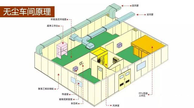 達(dá)到要求的這樣一個(gè)穩(wěn)定生產(chǎn)環(huán)境即稱為無塵車間,也叫潔凈廠房、潔凈室(Clean Room)、無塵室。無論外部條件怎么變化,其室內(nèi)均能維持符合原先設(shè)定要求的潔凈度、溫濕度及壓力等性能。