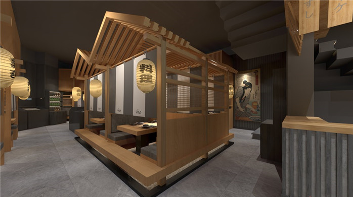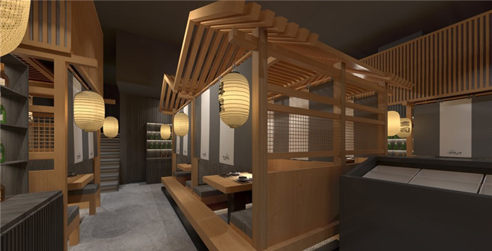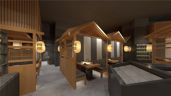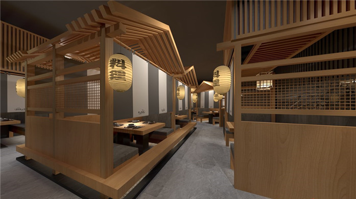 整體設計風格上以日式精致私密性為主,每個餐臺都有獨立的隔斷進行分割,這樣在整個空間中就會形成錯落有致的空間布局,不僅美觀而且空間利用率高,同時保障了顧客就餐的私密性。