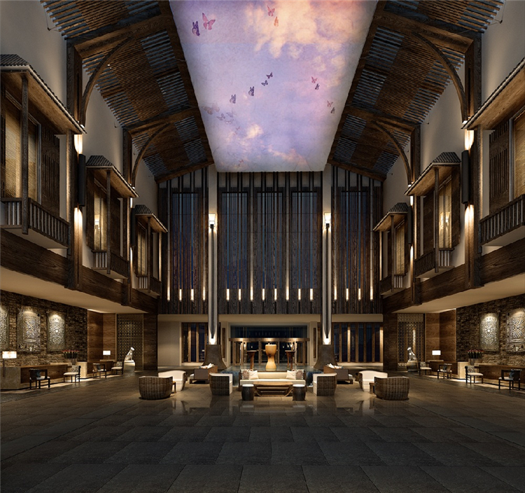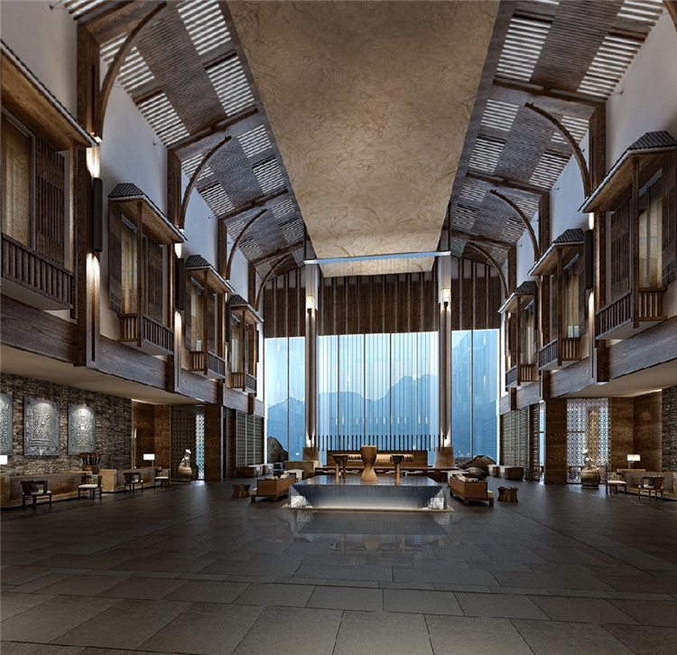 本案度假酒店的室內(nèi)設(shè)計(jì)靈感來(lái)自于瑤族民居的生活態(tài)度,并結(jié)合對(duì)大自然的尊重,運(yùn)用天然素材以當(dāng)代風(fēng)格重新演繹傳統(tǒng)設(shè)計(jì)。山水表現(xiàn)“瑤美”,鼓火表現(xiàn)"瑤情”,圖騰犬則表現(xiàn)“瑤魂”。以盛大的篙火晚會(huì)為藍(lán)本。融入舞臺(tái)和展示空間的概念。以此增加戲劇化效果。提升賓客對(duì)空間的精神感知。