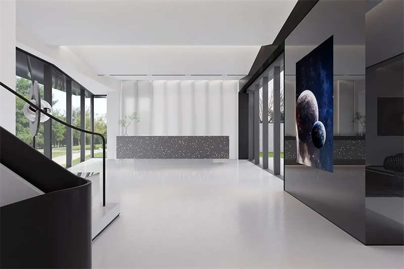 一層前臺(tái),以黑白創(chuàng)作出一個(gè)極致簡(jiǎn)潔的空間,兩側(cè)落地開(kāi)窗實(shí)現(xiàn)無(wú)限延伸,空間的邊界更加柔軟,內(nèi)庭院成為接待區(qū)的裝飾景觀,前臺(tái)及背景以“帆”這一意象表達(dá)對(duì)于宇宙世界探索的起航。樹(shù)脂地坪的無(wú)接縫特性解決了材質(zhì)拼接的繁瑣,讓空間更加純粹簡(jiǎn)潔。