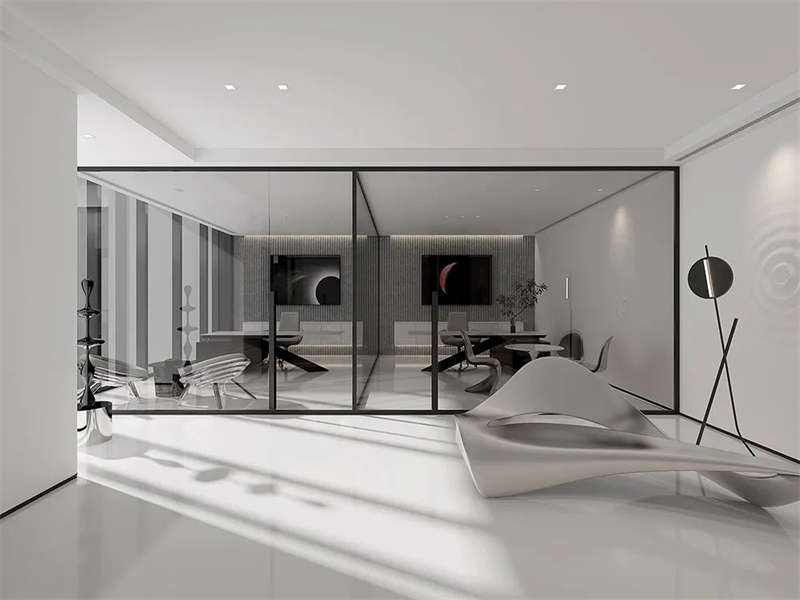 接待區(qū)以沙發(fā)組和會(huì)議室實(shí)現(xiàn)休息、接待、和會(huì)議功能。沙發(fā)地毯圍合成舒適的功能區(qū),落地?zé)?、藝術(shù)裝置讓這里更有會(huì)客廳的親切感,灰色與白色的搭配經(jīng)典時(shí)尚。
