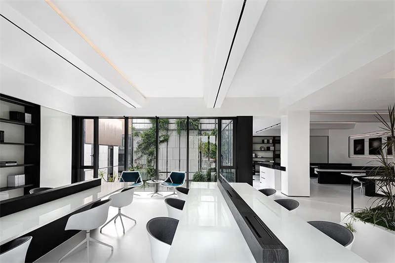 建筑是凝固的音樂(lè),音樂(lè)是流動(dòng)的建筑。二、三層分別是開(kāi)敞式辦公和高管辦公區(qū),空間整體黑白分明、線條硬朗,像是鋼琴的黑白鍵,揮灑自如,動(dòng)人的旋律,或悠揚(yáng)或激昂。