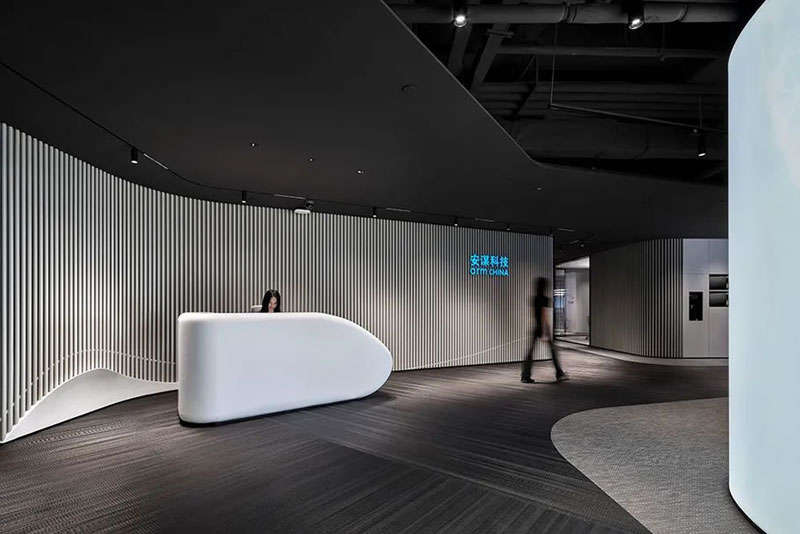 穿過會議區(qū)進入開放辦公區(qū)闊然開朗,色調(diào)由黑變淺,層層律動的地面紋理將蔚藍海洋天空的自然氣息引入到空間,律動的線性燈光交織輝映描述了Arm科技之源越過海洋略過山川的偉大之旅,植物和木色的點綴讓空間賦予對自然和科技的尊崇和平衡。