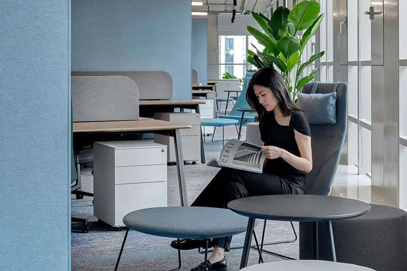 入戶的觀感尤為純粹,由一面數(shù)碼互動墻將視覺由電梯廳引入內(nèi)部,極致的暗調(diào)勾勒出明快的線性淺灰色logo墻并有向上延伸之感,自發(fā)光logo猶如秘境中的湛藍熒光寶石恬靜而自信的展現(xiàn)自我,黑色Bolon毯紋理隨著視覺的變化不斷變幻伴隨空間動線,將訪客緩緩引入內(nèi)場直達休憩區(qū),猶如數(shù)字科技傳動向前并引領(lǐng)未來。此處形式多樣的家具配合綠樹盈動,構(gòu)造了訪客和員工之間交融和平衡的靈動空間。