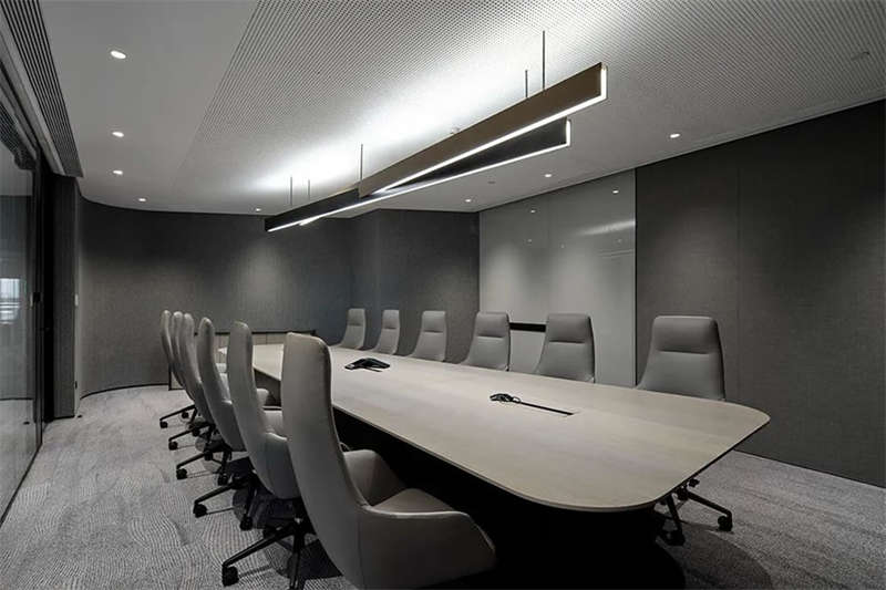 進入會議空間,設(shè)計師刻意控制它的視覺張力,前區(qū)的體驗得以延續(xù),灰黑色調(diào)覆蓋目力所及并引入更多的柔性材料,專業(yè)、專注是會議空間的功能立本但也不乏我們對活力元素的照拂,每一個會議室我們都選擇了形式各樣的藍色地毯來裝點。