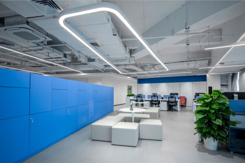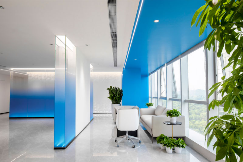為了體現(xiàn)客戶的品牌形象和影響力,設(shè)計(jì)師將“創(chuàng)新、科技、便捷”的理念融入到空間的每個(gè)環(huán)節(jié),從企業(yè)的VI色中提取出藍(lán)色運(yùn)用到整體空間中。