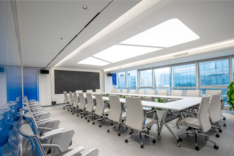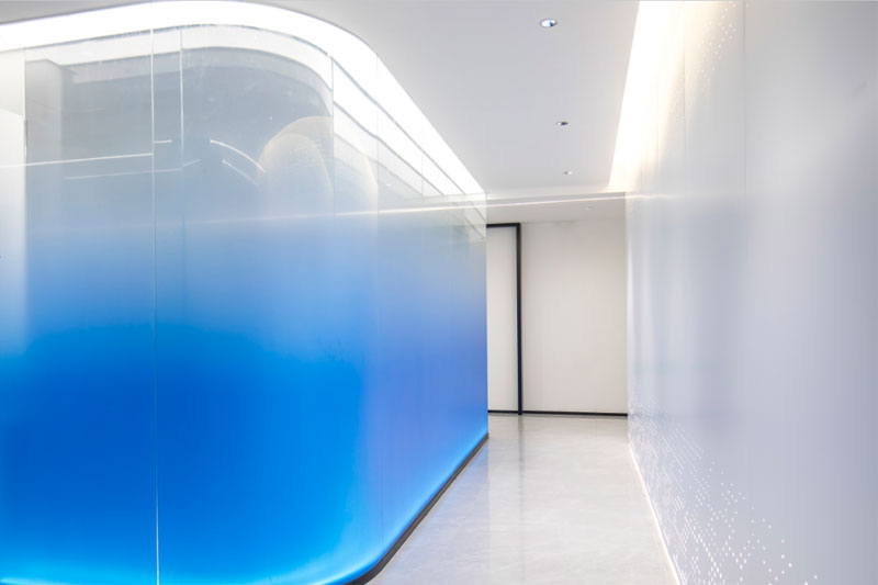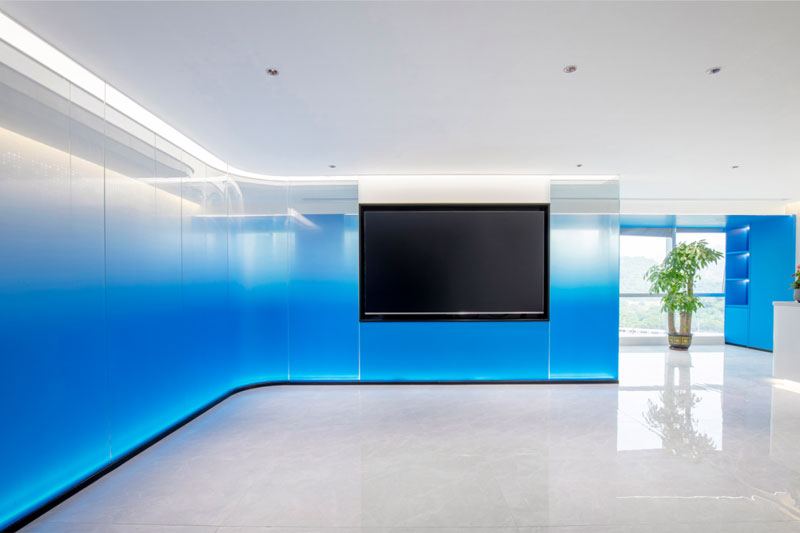 大小會(huì)議室都延續(xù)了空間的藍(lán)色基調(diào),利用通透的藍(lán)色玻璃分隔過(guò)道,使空間更加通透明亮,不僅讓視感增強(qiáng),也深刻的加強(qiáng)了品牌形象在訪客心中的作用。