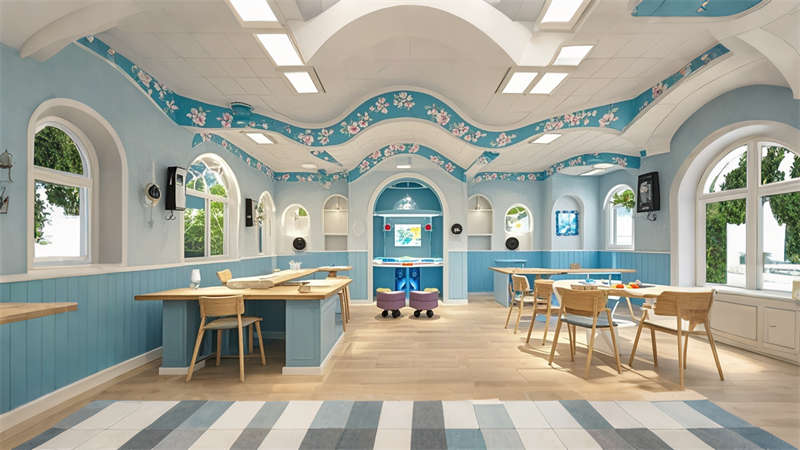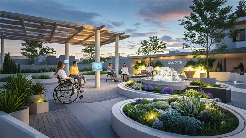 重點(diǎn)區(qū)域采用防滑橡膠地板、圓角處理家具、緊急呼叫裝置等 35 項(xiàng)適老細(xì)節(jié),照明系統(tǒng)采用 4000K 暖白光搭配智能調(diào)光。醫(yī)療區(qū)設(shè)置獨(dú)立新風(fēng)機(jī)房,活動(dòng)區(qū)配置體感互動(dòng)設(shè)備,戶(hù)外花園集成霧森降溫和夜光導(dǎo)航系統(tǒng),打造安全、舒適、智能的現(xiàn)代養(yǎng)老空間。